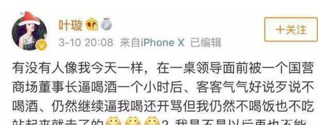 最后苗苗只能脱下高跟鞋,光着脚在众人注视下跳完了整首歌,地板硌得脚疼,心里更疼。 后来她演完《芳华》就嫁了人,几乎不再踏足娱乐圈,大概是真的厌恶了这种被强迫的滋味。 叶璇算是敢反抗的,可也没少受气。有次她被邀请参加酒宴,一个国营单位的董事长非要逼她喝酒,她再三说自己不喝,对方直接就急眼了,不仅逼酒还开骂。 僵持了一个小时,叶璇饭都没吃就走了,事后发文曝光了这件事,才知道那位董事长仗着位高权重,平时作威作福惯了,还曾炫耀自己“泡过商场1000多名销售小姐”。